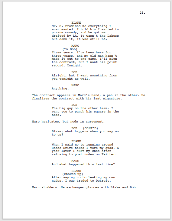 I forgot about Plaxico’s legal troubles until rereading this. Still so much that would need to be cut from these pages. Marc’s reading of the fine print could simply be cut down to Bob iterating that Marc could face jail time for his marketing exploits. I believe this page was originally where act two ended.