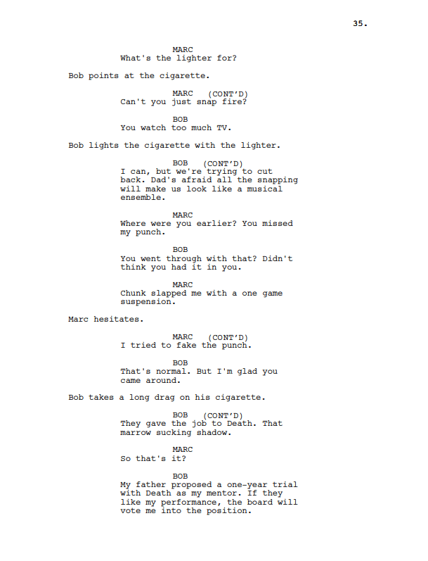 Bob, the son of Satan, sets out to strike a deal with a down-on-his-luck college basketball player, in hopes of taking over his father’s marketing firm (Yikes, I know). Marc, the basketball player, has just suffered another concussion and has just had his first run in with Bob. After some back-and-forth, Marc agrees to Bob’s proposal and uses some of his new powers in a game. Things are going great until Bob asks Marc to punch an opposing player in the face. When he refuses, the powers disappear with the game on the line.