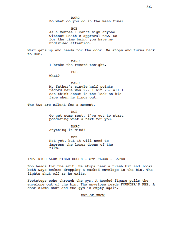 Ahh, the founder’s fee. Such a fun little ending. I don’t think I really had an idea for who it was. Part of me wanted it to be Sarah. Another part of me wanted it to be Marc’s dad. Not sure where I would take it now if I’m being honest.